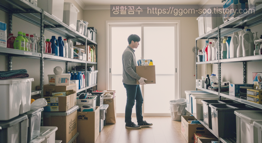 카테고리별 정리: 세탁용품→청소용품→생활용품→예비용품 순서로 분류. 사용 빈도별로 1군(매일), 2군(주 1-2회), 3군(월 1회 이하)로 재분류.