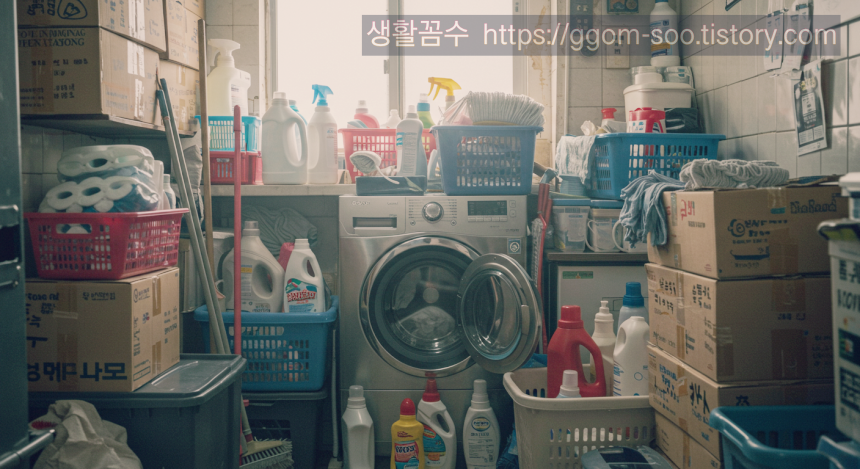 또 다른 문제는 수납 시스템의 부재입니다. 세제, 청소용품, 세탁용품, 생활용품이 뒤섞여 있어서 필요한 걸 찾으려면 온갖 것을 다 뒤져야 해요. 이렇게 매번 찾는 시간이 쌓이면 스트레스가 되고, 급할 때는 같은 물건을 또 사오게 되는 악순환이 반복됩니다.
